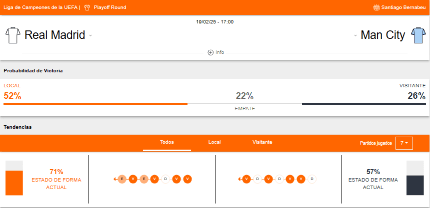 ¡Bienvenido al centro de datos del próximo pronostico deportivo del partido de la Noticias entre Real Madrid vs Man City! Aquí en Betsson encontrarás todos los detalles relevantes sobre el partido programado para el 19/02/2025 17:00:00 (UTC-03:00).