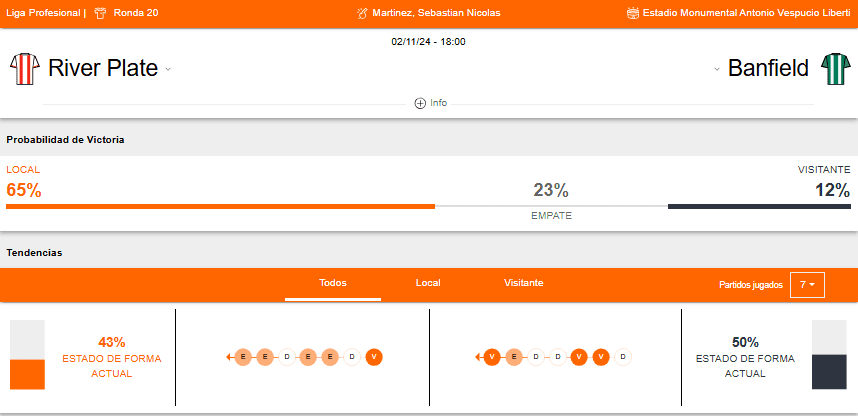 ¡Bienvenido al centro de datos del próximo pronostico deportivo del partido de la Noticias entre River Plate vs Banfield! Aquí en Betsson encontrarás todos los detalles relevantes sobre el partido programado para el 02/11/2024 18:00:00 (UTC-03:00).