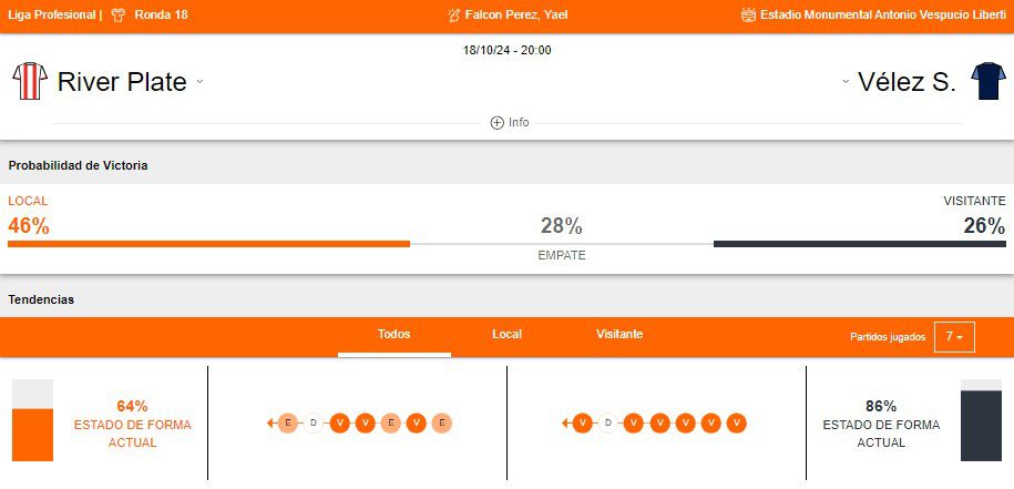 ¡Bienvenido al centro de datos del próximo pronostico deportivo del partido de la Noticias entre River Plate vs Vélez! Aquí en Betsson encontrarás todos los detalles relevantes sobre el partido programado para el 18/10/2024 22:00:00 (UTC-03:00).