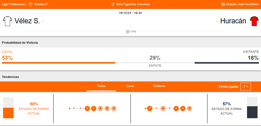 Probabilidad de victoria del enfrentamiento Vélez Sarsfield vs Huracán