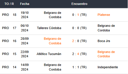 Por su parte, Belgrano viene de una derrota 0-1 ante Platense, resultado que dejó al equipo sin sumar en la última jornada. En sus últimos cuatro encuentros, la visita ha registrado un desempeño moderado con 2 empates y 2 victorias, en los que ha anotado 7 goles y ha recibido 4. Esta racha irregular ha dejado al equipo en la décimo tercera posición de la tabla con 25 puntos (6 PG – 7 PE – 5 PP). A pesar de estar en una posición intermedia en el torneo, Belgrano tiene la oportunidad de dar la sorpresa ante el puntero del campeonato.